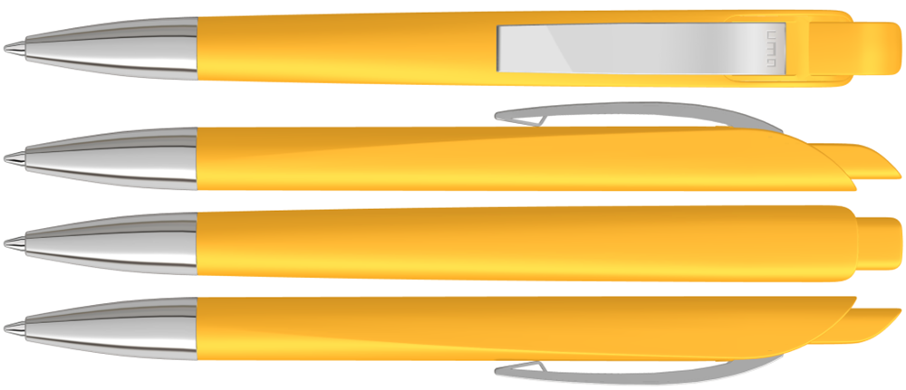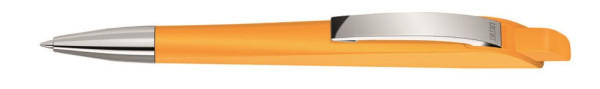 Druckkugelschreiber mit geometrisch wechselnder Schaftform. Gehäuse und Drücker gedeckt matt, Metallclip und Metallspitze glanzverchromt.