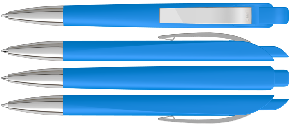 Druckkugelschreiber mit geometrisch wechselnder Schaftform. Gehäuse und Drücker gedeckt matt, Metallclip und Metallspitze glanzverchromt.