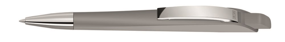 Druckkugelschreiber mit geometrisch wechselnder Schaftform. Gehäuse und Drücker gedeckt matt, Metallclip und Metallspitze glanzverchromt.