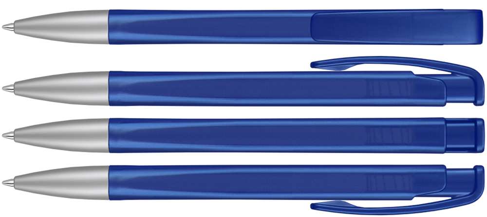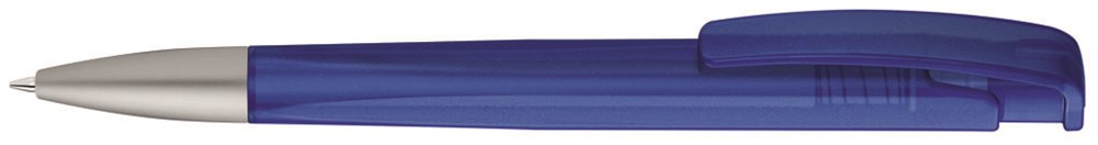 Druckkugelschreiber mit geometrisch wechselnder Schaftform, transparent gefrostetem Gehäuse und Metallspitze matt verchromt.