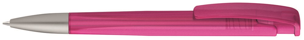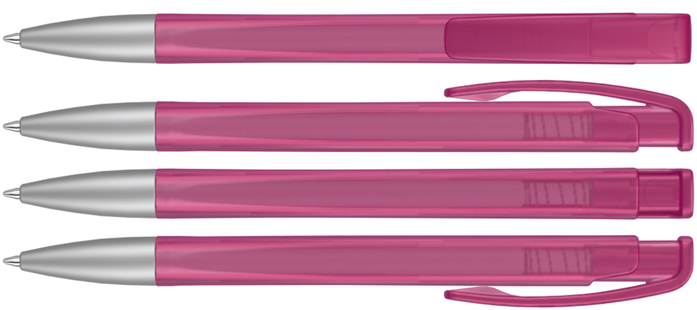 Druckkugelschreiber mit geometrisch wechselnder Schaftform, transparent gefrostetem Gehäuse und Metallspitze matt verchromt.