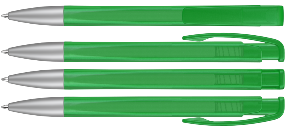 Druckkugelschreiber mit geometrisch wechselnder Schaftform, transparent gefrostetem Gehäuse und Metallspitze matt verchromt.