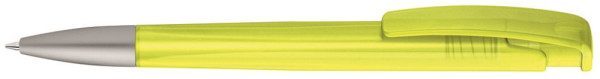 Druckkugelschreiber mit geometrisch wechselnder Schaftform, transparent gefrostetem Gehäuse und Metallspitze matt verchromt.