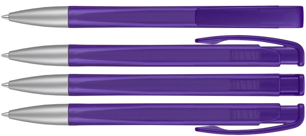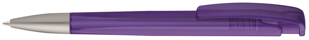 Druckkugelschreiber mit geometrisch wechselnder Schaftform, transparent gefrostetem Gehäuse und Metallspitze matt verchromt.