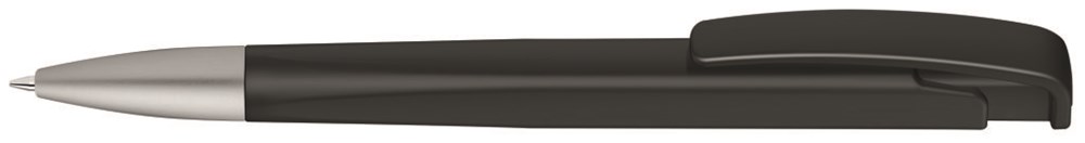 Druckkugelschreiber mit geometrisch wechselnder Schaftform, matt gedecktem Gehäuse und Metallspitze matt verchromt.