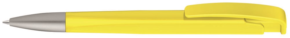 Druckkugelschreiber mit geometrisch wechselnder Schaftform, matt gedecktem Gehäuse und Metallspitze matt verchromt.