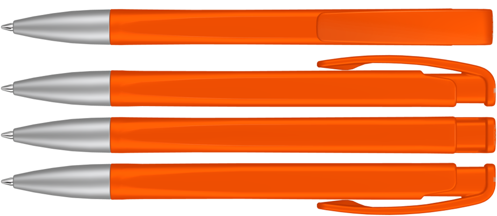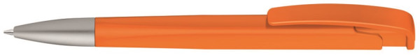 Druckkugelschreiber mit geometrisch wechselnder Schaftform, matt gedecktem Gehäuse und Metallspitze matt verchromt.