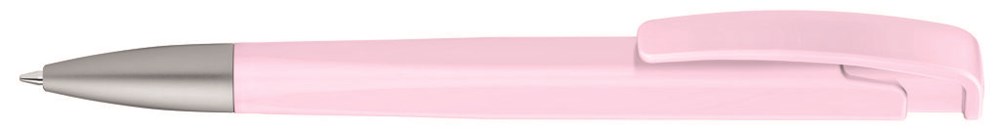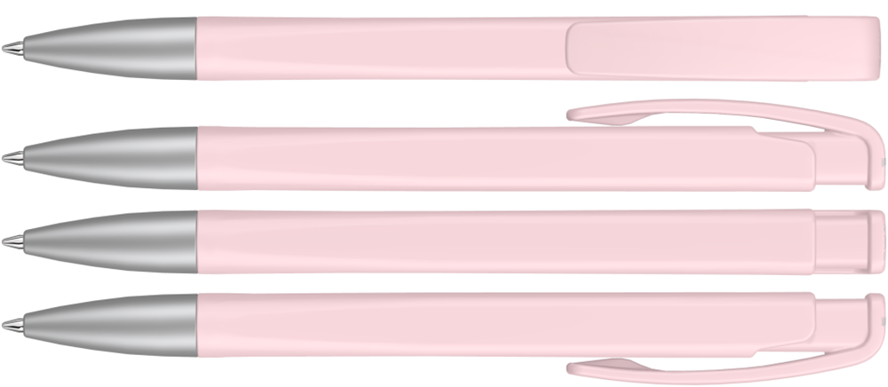Druckkugelschreiber mit geometrisch wechselnder Schaftform, matt gedecktem Gehäuse und Metallspitze matt verchromt.