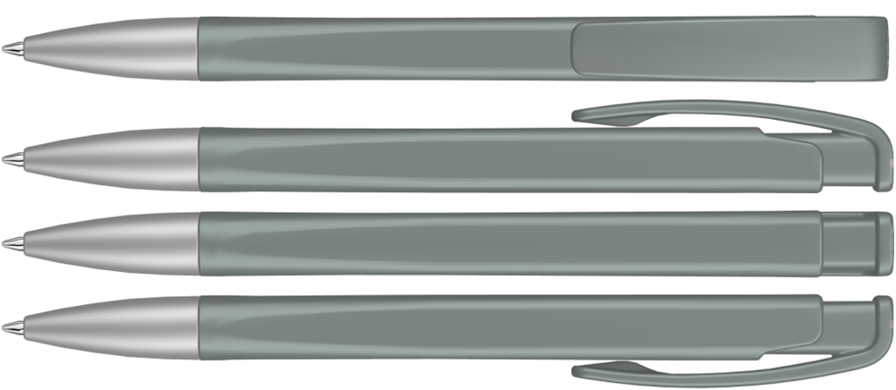 Druckkugelschreiber mit geometrisch wechselnder Schaftform, matt gedecktem Gehäuse und Metallspitze matt verchromt.