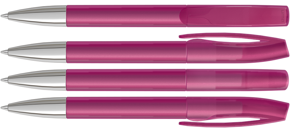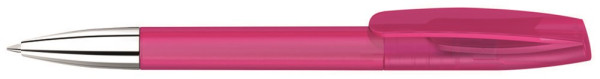 Drehkugelschreiber mit transparent gefrostetem Gehäuse und silberner Spitze glanzverchromt.