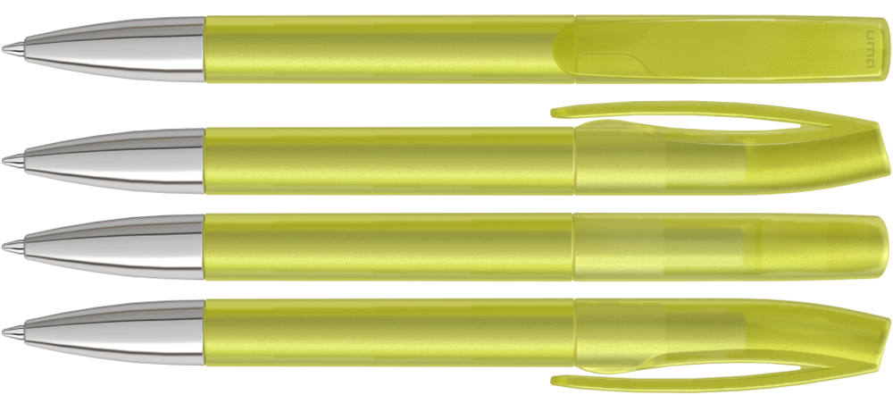 Drehkugelschreiber mit transparent gefrostetem Gehäuse und silberner Spitze glanzverchromt. mehr