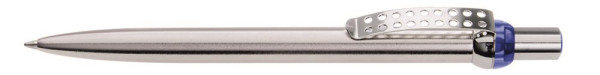 Metall-Druckkugelschreiber mit verchromtem und lackiertem Schaft. Obere Halbkugel und Stopfen farbig transparent. Gelochter Metallclip, Drücker und untere Halbkugel verchromt.