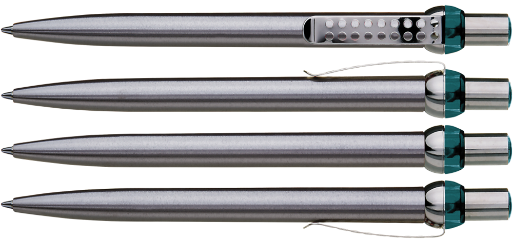 Metall-Druckkugelschreiber mit verchromtem und lackiertem Schaft. Obere Halbkugel und Stopfen farbig transparent. Gelochter Metallclip, Drücker und untere Halbkugel verchromt.
