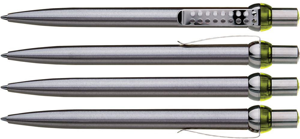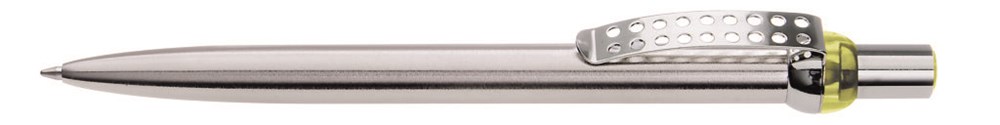 Metall-Druckkugelschreiber mit verchromtem und lackiertem Schaft. Obere Halbkugel und Stopfen farbig transparent. Gelochter Metallclip, Drücker und untere Halbkugel verchromt.