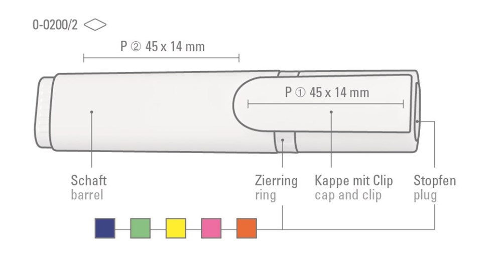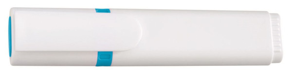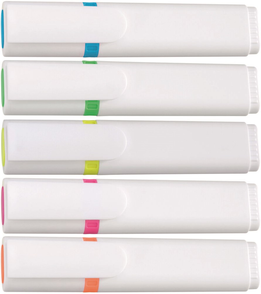 Textmarker mit Kunststoffgehäuse, Kappe und Clip in weiß. Mundstück mit Zierring und Stopfen in der Schreibfarbe. Standardfarben gelb, grün, magenta, blau, orange.