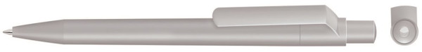 Druckkugelschreiber mit gedeckt mattem Gehäuse, Clip, Drücker und Stopfen.