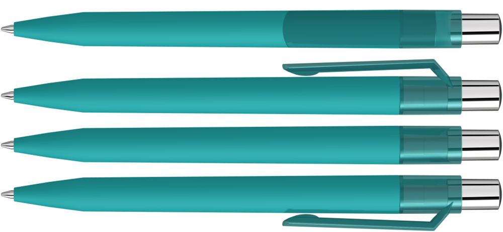 Druckkugelschreiber mit Softtouch-Schaft, transparent glänzendem Clip, silber glänzendem Drücker und farbigem Stopfen.