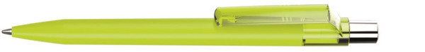 Druckkugelschreiber mit Softtouch-Schaft, transparent glänzendem Clip, silber glänzendem Drücker und farbigem Stopfen.
