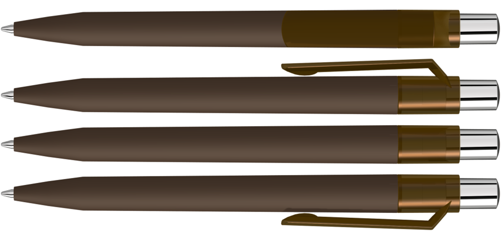 Druckkugelschreiber mit Softtouch-Schaft, transparent glänzendem Clip, silber glänzendem Drücker und farbigem Stopfen.
