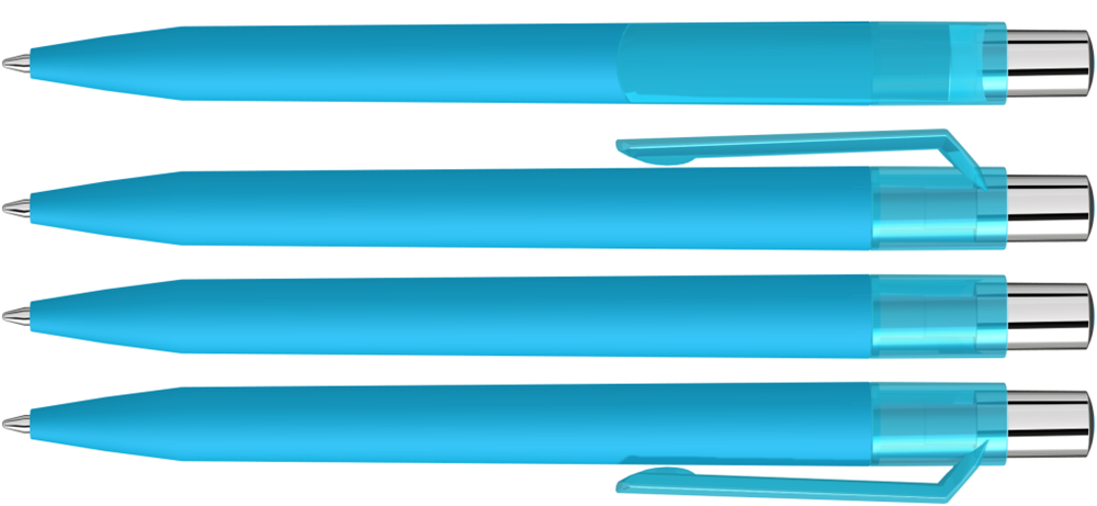 Druckkugelschreiber mit Softtouch-Schaft, transparent glänzendem Clip, silber glänzendem Drücker und farbigem Stopfen.