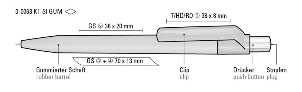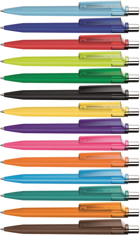 Druckkugelschreiber mit Softtouch-Schaft, transparent glänzendem Clip, silber glänzendem Drücker und farbigem Stopfen.