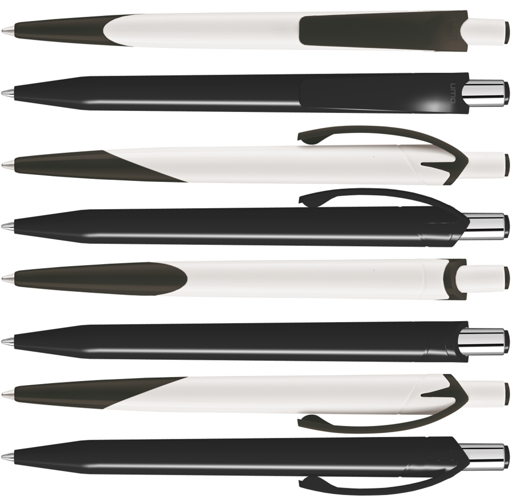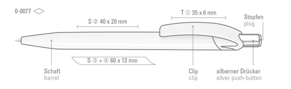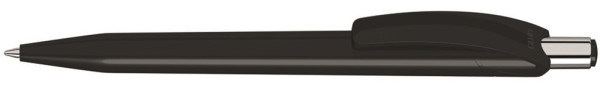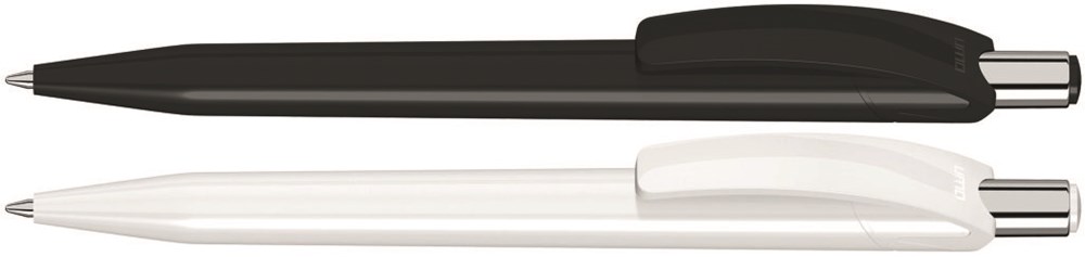 Druckkugelschreiber mit glänzend gedecktem Gehäuse und Drückerstopfen in schwarz oder weiß. Drücker in silber glänzend.