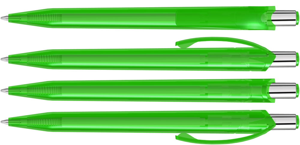 Druckkugelschreiber mit glänzend transparentem Gehäuse und Drückerstopfen. Drücker in silber glänzend.