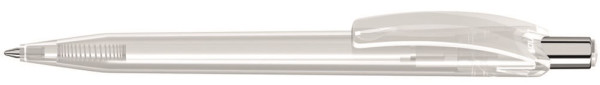 Druckkugelschreiber mit glänzend transparentem Gehäuse und Drückerstopfen. Drücker in silber glänzend.