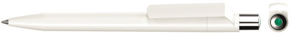 Druckkugelschreiber mit weiß gedeckt glänzendem Gehäuse, silber glänzendem Drücker und farbigem Stopfen.