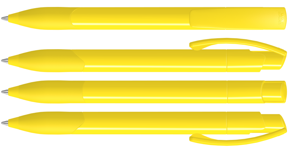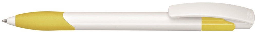 Druckkugelschreiber mit gedeckt glänzendem Schaft und Clipdrücker in weiß. Gummigriffzone und Manschette farbig.