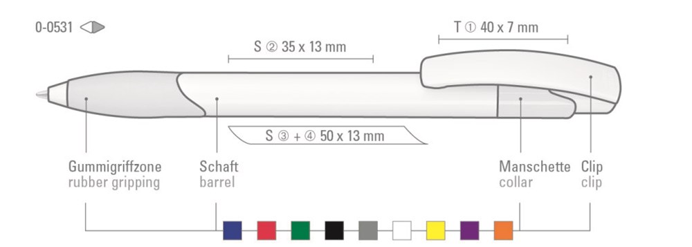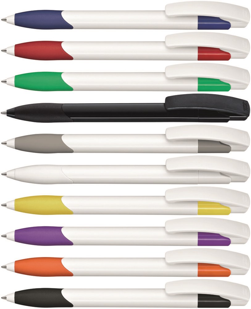 Druckkugelschreiber mit gedeckt glänzendem Schaft und Clipdrücker in weiß. Gummigriffzone und Manschette farbig.