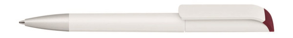Drehkugelschreiber mit gedeckt mattem Gehäuse in weiß, farbig glänzendem Stopfen und Spitze silber matt.