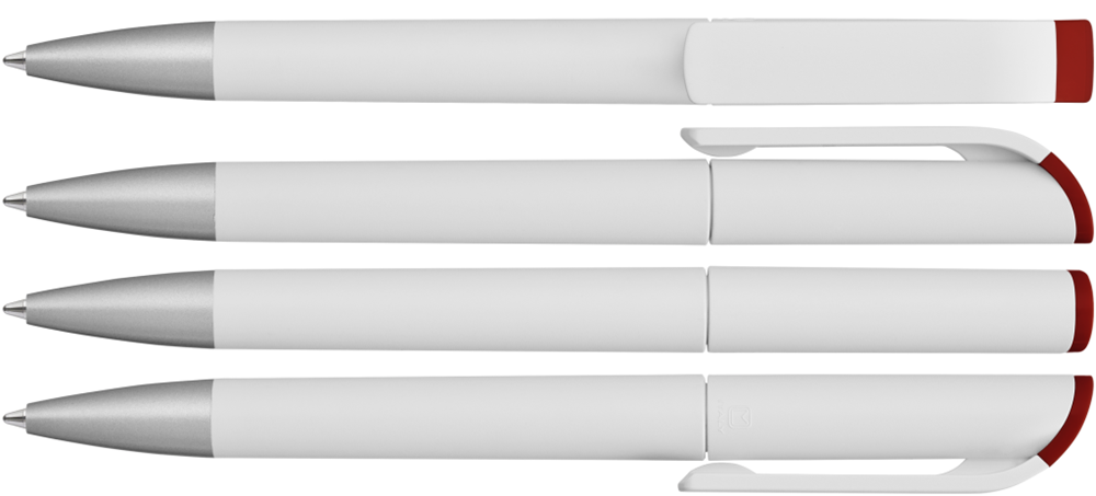 Drehkugelschreiber mit gedeckt mattem Gehäuse in weiß, farbig glänzendem Stopfen und Spitze silber matt.