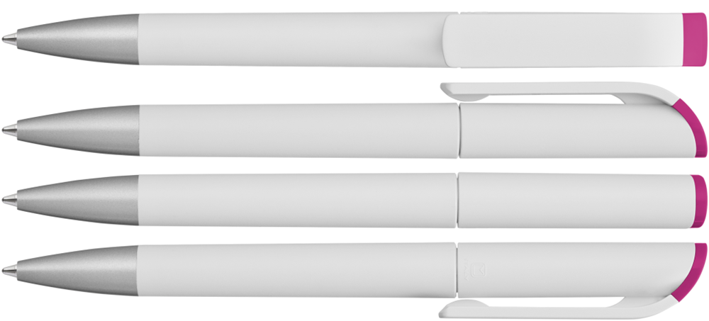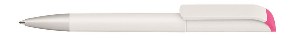 Drehkugelschreiber mit gedeckt mattem Gehäuse in weiß, farbig glänzendem Stopfen und Spitze silber matt.
