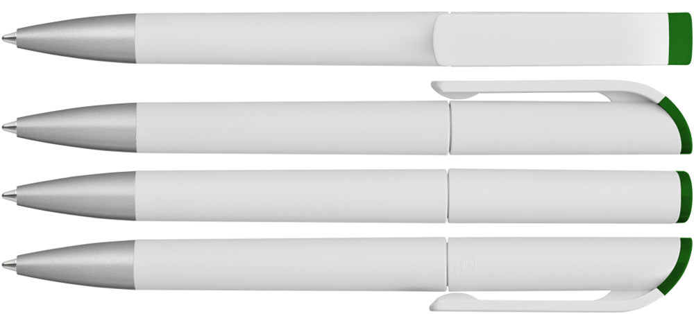 Drehkugelschreiber mit gedeckt mattem Gehäuse in weiß, farbig glänzendem Stopfen und Spitze silber matt.