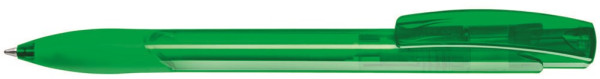 Druckkugelschreiber mit transparent glänzendem Schaft, Gummigriffzone und Clipdrücker.