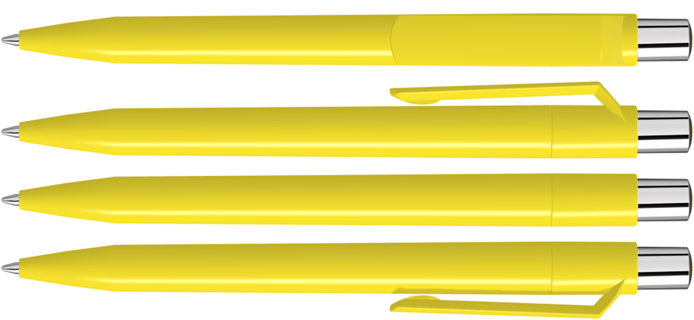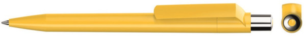 Druckkugelschreiber mit farbig gedeckt glänzendem Gehäuse, silber glänzendem Drücker und farbigem Stopfen.