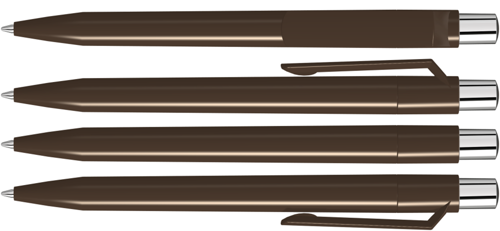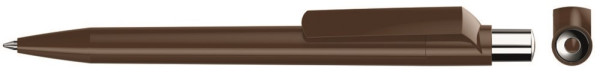 Druckkugelschreiber mit farbig gedeckt glänzendem Gehäuse, silber glänzendem Drücker und farbigem Stopfen.