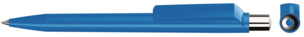 Druckkugelschreiber mit farbig gedeckt glänzendem Gehäuse, silber glänzendem Drücker und farbigem Stopfen.