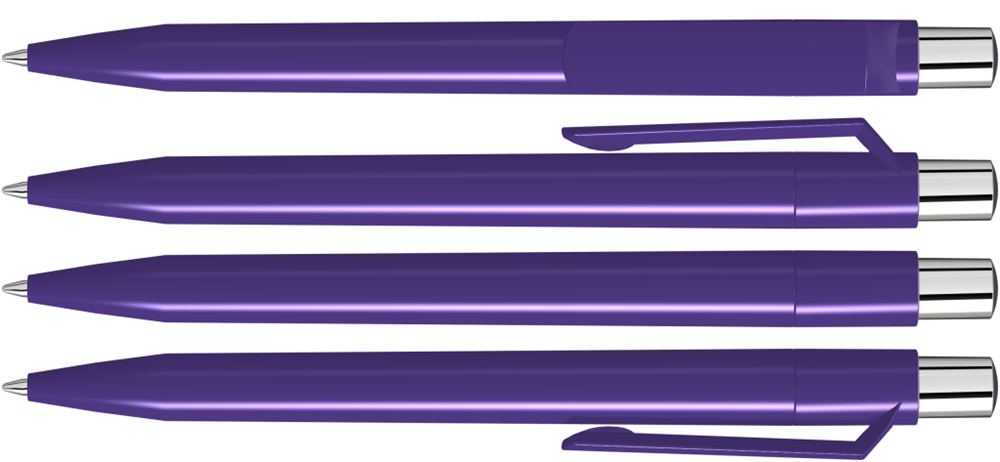 Druckkugelschreiber mit farbig gedeckt glänzendem Gehäuse, silber glänzendem Drücker und farbigem Stopfen.