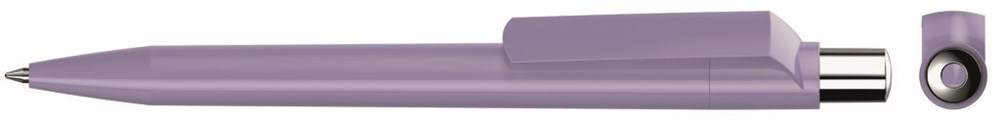 Druckkugelschreiber mit farbig gedeckt glänzendem Gehäuse, silber glänzendem Drücker und farbigem Stopfen.