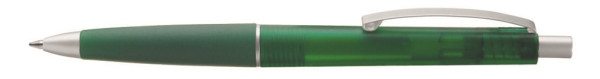 Druckkugelschreiber mit transparent gefrostetem Gehäuse, Gummigriffzone und geschwungenem Metallclip. Drücker, Zierring und Spitze in matt silber.