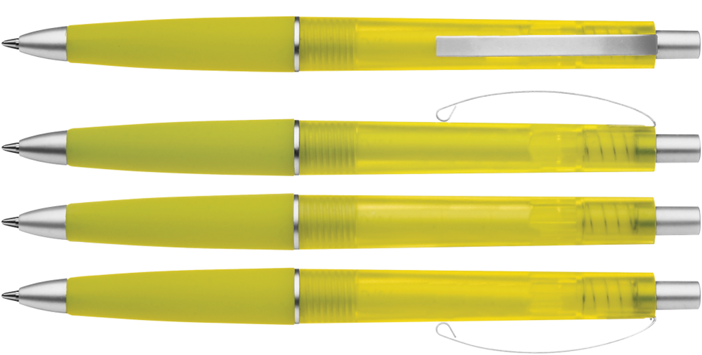 Druckkugelschreiber mit transparent gefrostetem Gehäuse, Gummigriffzone und geschwungenem Metallclip. Drücker, Zierring und Spitze in matt silber.