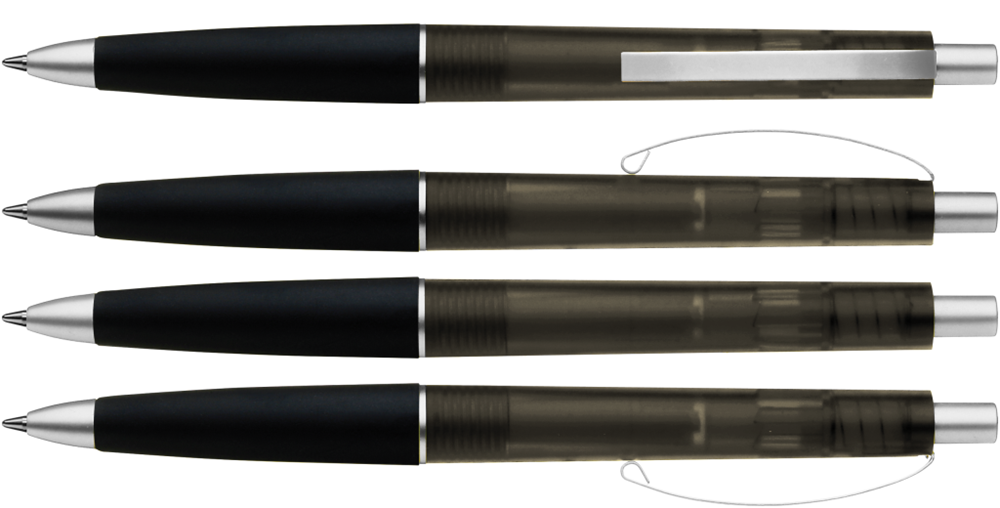 Druckkugelschreiber mit transparent gefrostetem Gehäuse, Gummigriffzone und geschwungenem... mehr