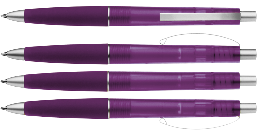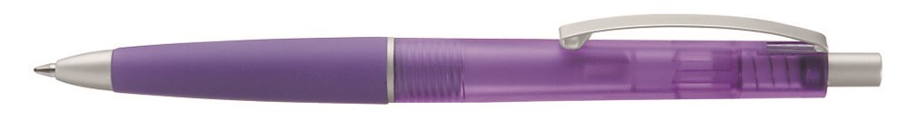 Druckkugelschreiber mit transparent gefrostetem Gehäuse, Gummigriffzone und geschwungenem Metallclip. Drücker, Zierring und Spitze in matt silber.