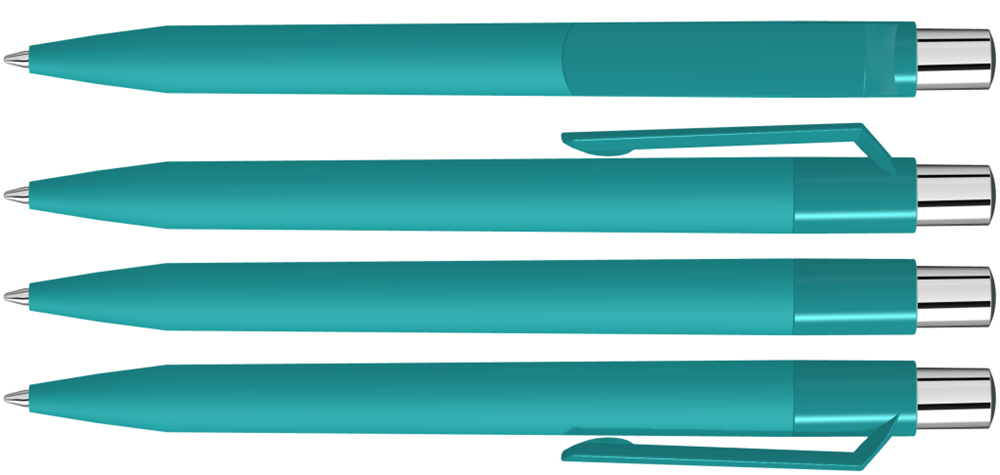 Druckkugelschreiber mit Softtouch-Schaft, gedeckt glänzendem Clip, silber glänzendem Drücker und farbigem Stopfen.