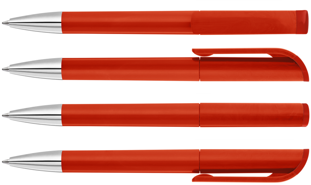 Drehkugelschreiber mit gedeckt glänzendem Gehäuse in weiß, farbig glänzendem Stopfen und Spitze glanzverchromt.