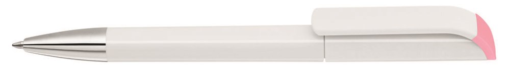 Drehkugelschreiber mit gedeckt glänzendem Gehäuse in weiß, farbig glänzendem Stopfen und Spitze glanzverchromt.