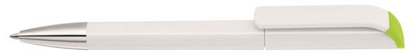 Drehkugelschreiber mit gedeckt glänzendem Gehäuse in weiß, farbig glänzendem Stopfen und Spitze glanzverchromt.