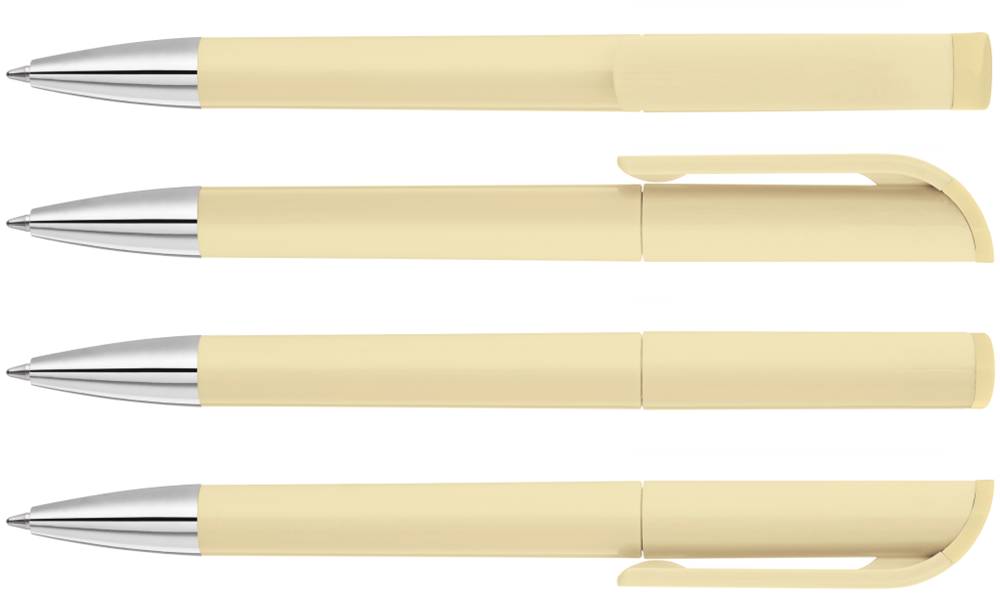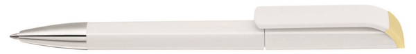 Drehkugelschreiber mit gedeckt glänzendem Gehäuse in weiß, farbig glänzendem Stopfen und Spitze glanzverchromt.